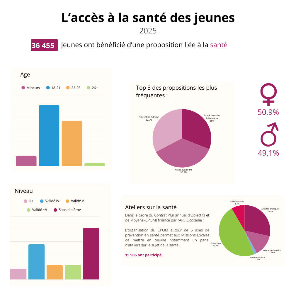 En 2025, sur 114 007 jeunes accompagnés par le réseau des Missions Locales, 36 455 jeunes ont bénéficié d’une proposition santé par leurs conseillers. Soit 32 %.